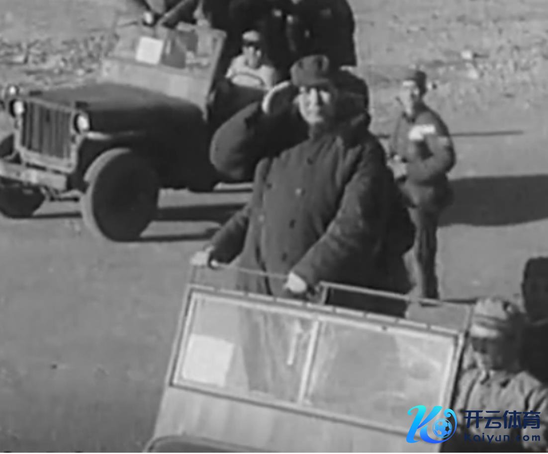 在一辆敞篷的吉普车上,毛主席衣服一件大衣,向受阅队列挥手请安。大家对毛主席高声喊谈:“毛主席万岁!毛主席万岁!毛主席万岁!……”